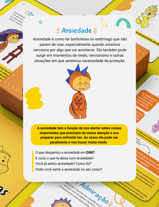 Cada carta traz uma emoção diferente, explorada de forma divertida e educativa, ajudando os pequenos a entender e expressar seus sentimentos. Junte-se a DINI nesta jornada colorida e transforme o aprendizado sobre emoções em um momento mágico de conexão e diversão familiar.